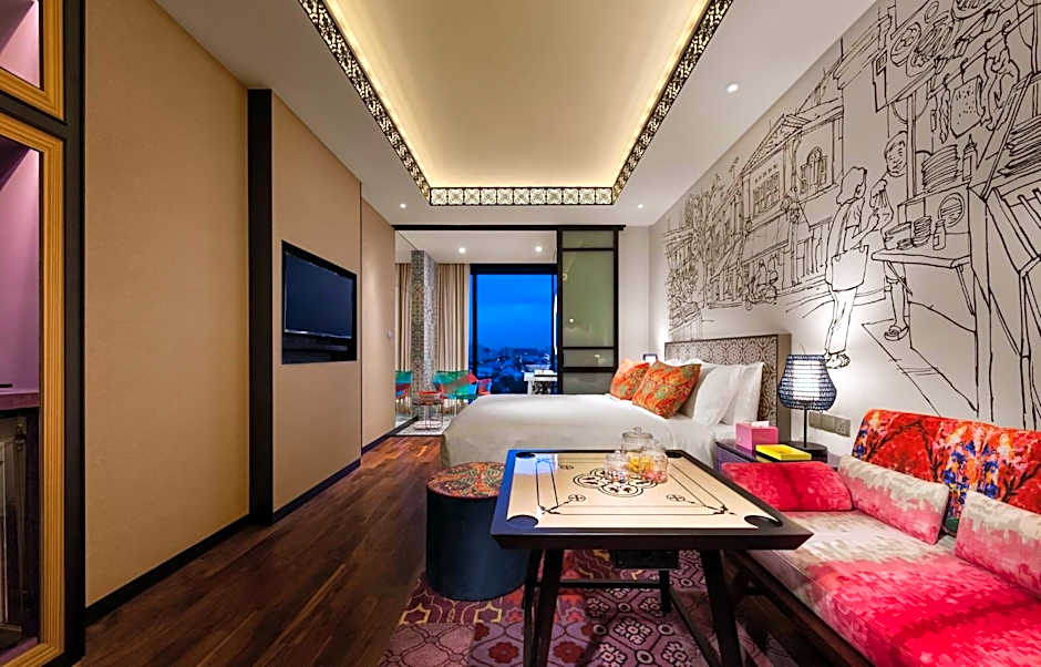 Featuring striking Peranakan designs and décor, this king room comes equipped with a flat-screen cable TV, mini-bar and smart LED lighting. The rooms offer views of the surrounding area through floor-to-ceiling windows. Private bathroom features a luxurious rain shower and complimentary toiletries.